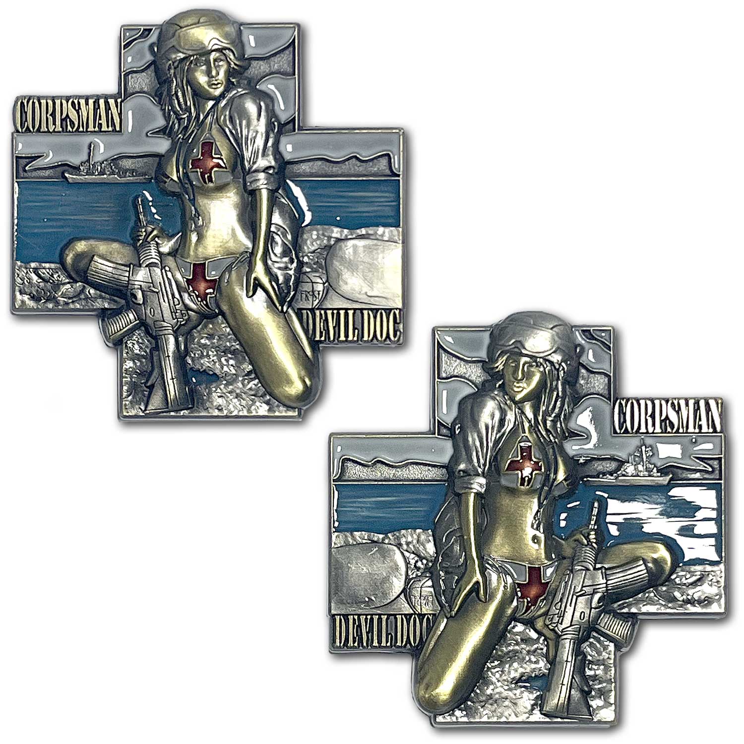 From bow to stern every US Navy challenge coin we craft like this Navy Corpsman Devil Doc Classic Pin Up Girls Collectible Challenge Coin is created with the highest level of attention to detail and quality. Above all things is our desire to provide nothing but the best in original US Navy artwork and design for a US Navy challenge coin for your command, warship, submarine or naval aviation squadron.Â