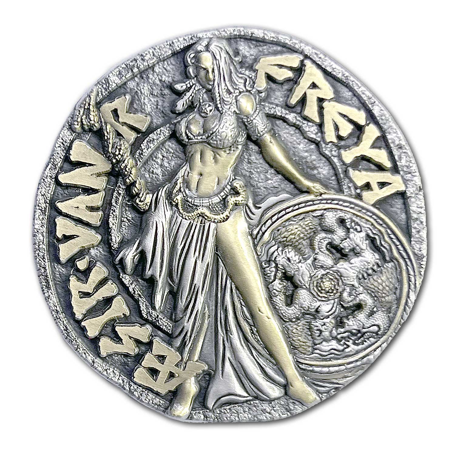 Inspired by the television History Channel series Vikings the Freyja Viking Goddess of Love, Beauty, Fertility, Sex, War Ancient Collectible Coin is one of the original mythological godlike coins offered by Vision-Strike-Coins.Com. At 2 inches the Aegir Viking Norse God Ancient Coin packs a powerful design with the fury of an ancient artistry. These ancient coins celebrate the many empires and civilizations of history. Inspired by games like Age Of Empires 2 which educates us on the powers and warring capabilities of past cultures like the ancient Greeks, Vikings, Celtics, Romans and their loyalty and dedication towards their gods. Each of these ancient coins feature dual toned antique silver and gold metals, produced with an original 3d look and the exclusive artwork of Stay Frosty Enterprises, LLC. These mythological and ancient coins are part of a collection of coin art that is created for coin collectors and those with an affinity towards history and the influence the ancient gods had over mankind, animals and the elements across the world.